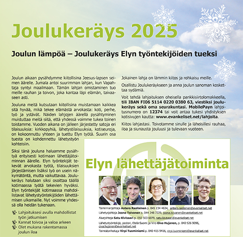 Siksi tänä jouluna haluamme pysähtyä erityisesti kotimaan lähettäjätoiminnan äärelle. Elyn työntekijät tekevät arvokasta työtä, tilaisuuksien järjestämisen lisäksi työ on usein näkymätöntä, mutta vaikuttavaa. Joulukeräys halutaan siksi osoittaa täällä kotimaassa työtä tekevien hyväksi. Elyn työntekijät kotimaassa mahdollistavat lähetystyöntekijöiden lähettämisen ulkomaille. Nyt voimme yhdessä olla heidän tukenaan.